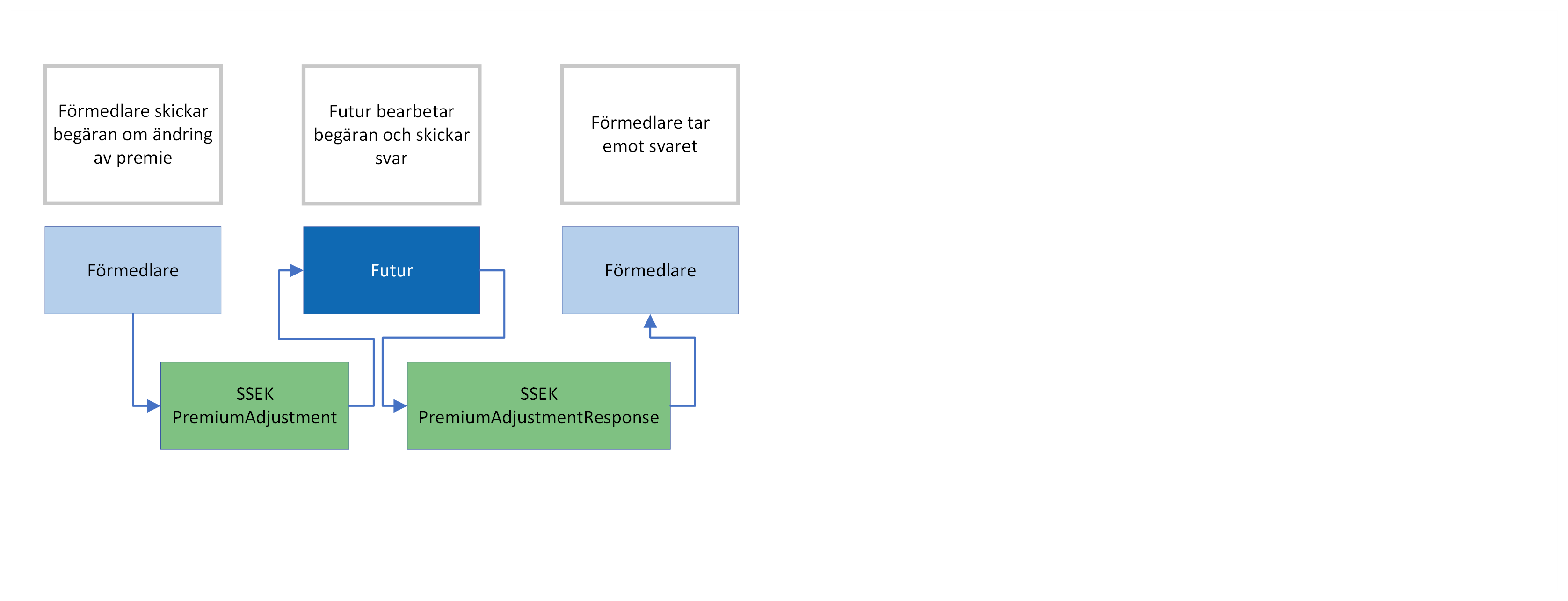 Begäran om att ändra premie på en försäkring sker med XML-schemat PremiumAdjustment. Efter att Futur bearbetat begäran, skickas ett svar med XML-schemat PremiumAdjustmentResponse.